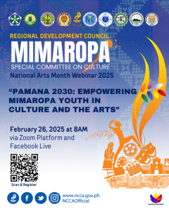 “Pamana 2030: Empowering MIMAROPA Youth in Culture and the Arts” would be taking place on February 26, 2025 via Zoom and live-streaming in official NCCA and respective SUC official social media accounts. According to the SCC, the term Pamana 2030 reflects a forward-looking commitment to heritage conservation and creative development along with the Sustainable Development Goals by 2030.
