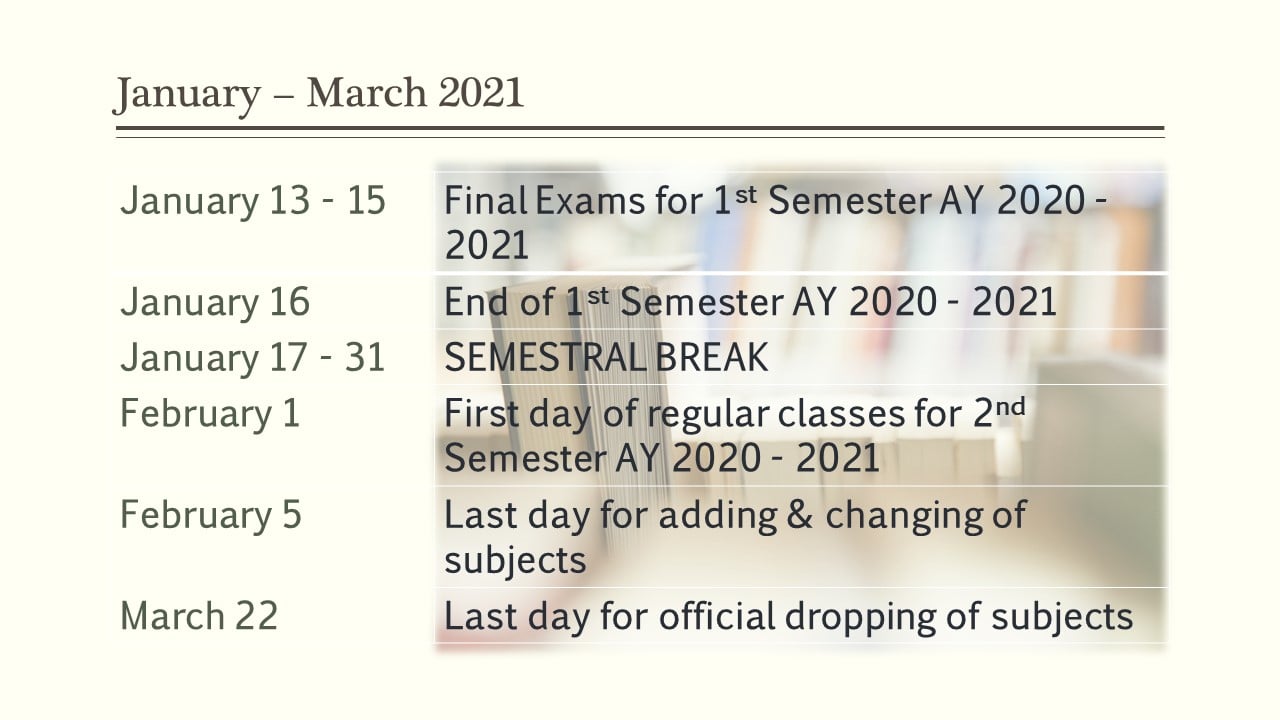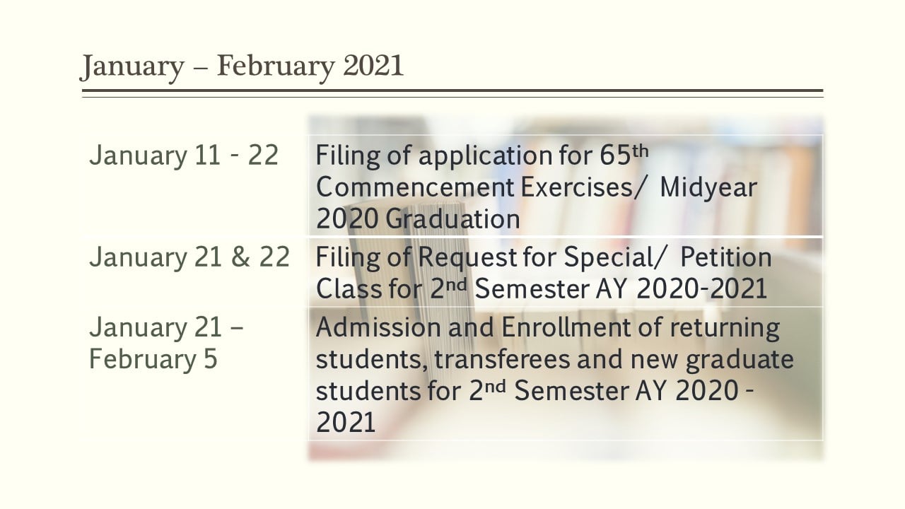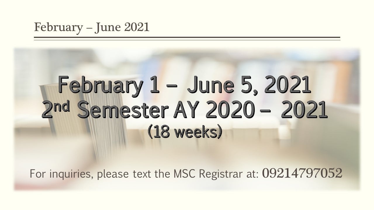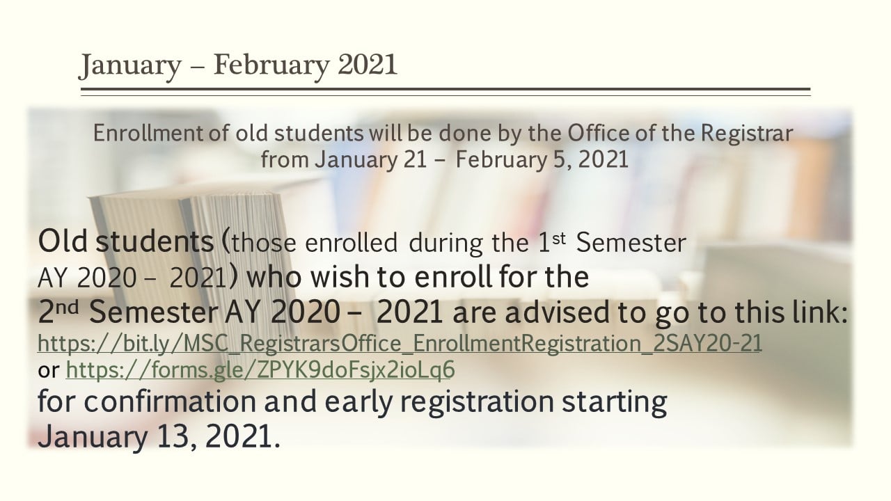 Old students (those enrolled during the 1st Semester of AY 2020 – 2021) who wish to enroll for the 2nd semester of AY 2020 – 2021, are advised to go to this link: https://bit.ly/MSC_RegistrarsOffice… or https://forms.gle/ZPYK9doFsjx2ioLq6 for confirmation and early registration starting January 13. 2021.