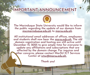 Posted on October 7, 2024 by Information Officer This is to inform the public on the updated domain of Marinduque State University from mscmarinduque.edu.ph to marsu.edu.ph. Thank you!