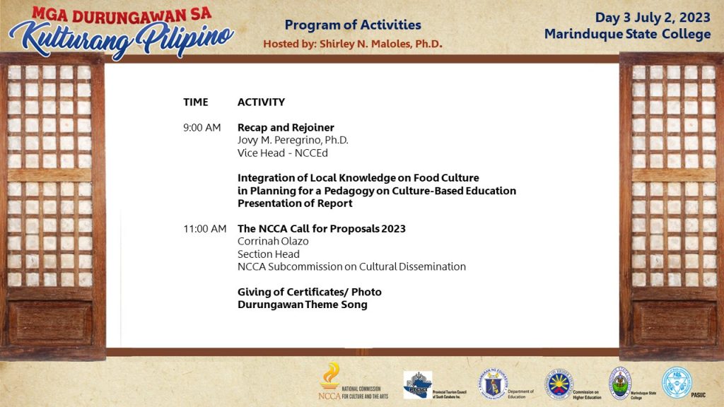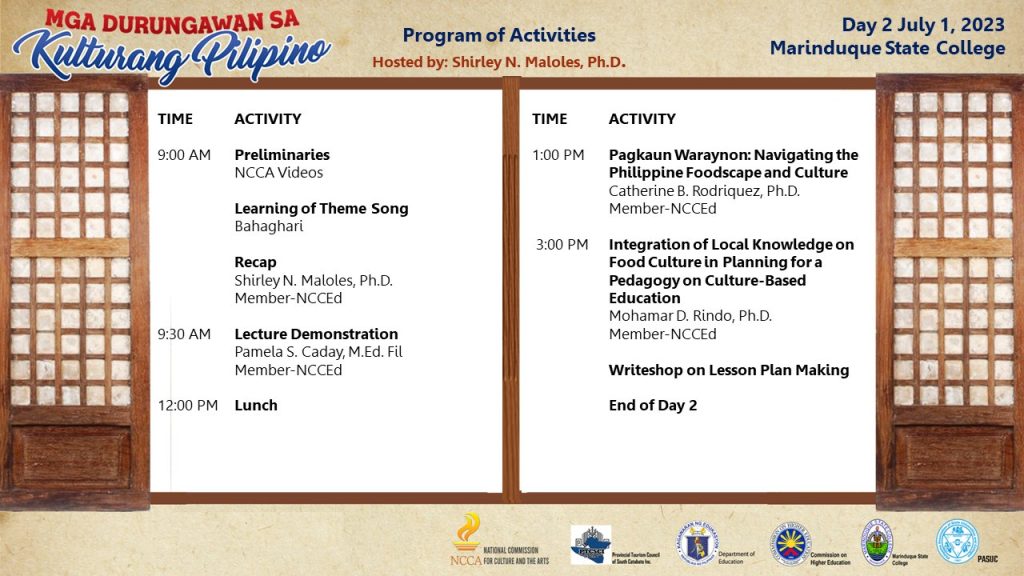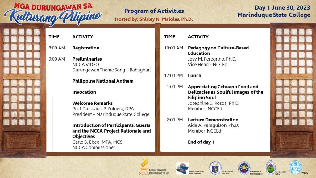 Boac, Marinduque – Pagkaraan ng tatlong taon, magkakaroon muli ng Mga Durungawan sa Kulturang Pilipino mula Hunyo 30 hanggang Hulyo 2 sa Marinduque State College (MSC) sa pagtataguyod ng ambansang Komisyon para sa Kultura at mga Sining (NCCA).