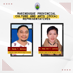 The composition of the Provincial Culture and Arts include the Chairman, Hon. Presbitero J. Velasco, Jr.-Governor or his duly authorized representative with members Hon. Adeline M. Angeles-Vice Governor, Mr. Danilo R. Red-Chairperson and Committee on Education, Culture and Arts, Hon. Antonio L. Mangcucang III-Chairperson and Committee of Tourism Development and Cultural Heritage, Ms. Marian M. Cunanan-Provincial Planning & Development Office, Mr. Jose Rino P. Labay-OIC Provincial Tourism Officer, Dr. Lynn G. Mendoza-School Division Superintended, DepEd, Dr. Zoraida U. Amper, CSTE- TESDA Provincial Director, Ms. Ruby Ann T. Lantita-Culture and Arts Director, Marinduque State University, Mr. Marjonier Malabanan-Admin Officer of National Museum-Marinduque, Mr. German F. Yap-Provincial Director of DILG-Marinduque, Romeo Mataac Jr.-Philippine Information Agency, Ms. Susan M. Nace-President of Marinduque Tourism Development Council, Ms. Christina Josefina Festin Tan-President of Philippine Chamber of Commerce Industry-Marinduque, Mr. Dranreb R. Delos Reyes-Provincial Youth Development Officer, Mrs. Lourdes T. Uy-Owner of Goodyear Company, Mr. Jerson C. Manahan-Music Educator & Local Music Culture Representative, Dr. Randy T. Nobleza-National Committee on Language and Translation member-NCCA, and Dr. Dionisio O. Camato-Regional Director, CHED.