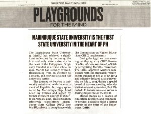 Now the whole nation knows. Marinduque State College’s conversion into Marinduque State University was recently featured in the Playgrounds for the Mind section of the prominent national broadsheet, the Philippine Daily Inquirer.