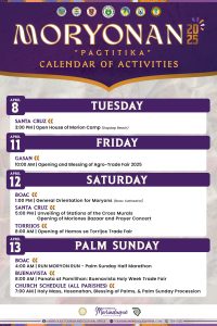 There would be an open house of Morion camp in Sta. Cruz on April 8 and an opening with blessing of Agro-Trade Fair 2025 in Gasan. In addition, there would be a general orientation for Moryons in Boac Cathedral on April 12, then unveiling of stations of the cross murals and opening of Moriones Bazaar and prayer concert in Sta Cruz. Then there would be an opening of Hamos sa Torrijos Trade fair on Saturday.