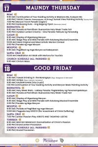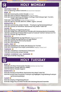 By April 14, Holy Monday there would be province-wide wearing of caftan attire, in Boac there would be community Lenten Parade, start of moriones registration, grand opening and ribbon cutting of Marinduque Agri-Tourism, Trade and Food Fair 2025, tour guiding by Boac Municipal Scholars and Morion parde by MISTAH, KMMK, Legion and Lancea. Then there would be simultaneous activities in Buenavista, Gasan, Mogpog, Sta Cruz and Torrijos in observance of Holy Monday.