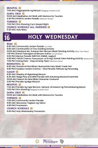 On April 16, Holy Wednesday, there would be Maskara mo, Kukayan mo in Boac, Grand Tubungan in Moryon Area, Morion Parade, TAKAS (Talento, Kasaysayan, at Sining) Sunset viewing painting activity and unang dula – lumang tipan in Moriones arena in Boac. Then, there would be outdoor Lenten cinema – Sine Panata Pelikula ng Pananalig in Buenavista. While, there would be a search for best bible character costume and parade ng mag moryon in Gasan. In addition, parada ng mga moryon and film showing in Mogpog. Then a Moryonan Tagisan ng Talino in Torrijos would take place before the Wednesday procession all over the Diocese in Marinduque.
