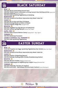 On Palm Sunday, there would be “Run Moryon Run – half-marathon in Boac, panata at pamilihan Buenavista Holy week Trade fair in Buenavista coinciding with the respective church schedule in all parishes in Marinduque with holy mass, hosanahan, blessing of palms and Palm Sunday procession.