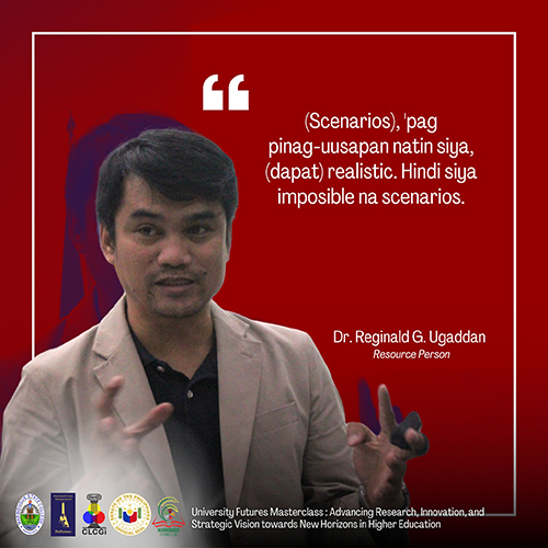 The last session, “Blueprints of the Future through Scenario Development” was facilitated by Dr. Dr. Reginald Ugaddan. He discussed the four-quadrant scenario building framework to help participants visualize potential future trajectories of their chosen topic.