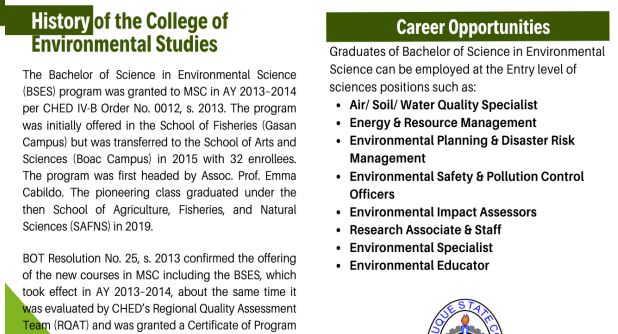 BOT Resolution No. 25, 2. 2013 confirmed the offering of the new courses including BSES effective AY 2013 – 2014, about the same time it was evaluated by CHED’s Regioual quality Assessment Team (RQAT) and authorized by the Commission on Higher Education. Thus, MSC BOT Resolution No. 58, s. 2013 approved the objective statements of the Bachelor of Science in Environmental Science. Due to the growing relevance of the field of Environmental Science, BOT Res. No. 12, s. 2020 subsequently created the new School of Environmental Sciences where the BS in Environmental Sciences was to be offered effective AY 2020-2021. MSC’s Administration also designated the newly “commissioned” MSC Extramural Studies Center in Capayang, Mogpog as home to the School with Prof. Homer L. Montejo as Center Administrator.